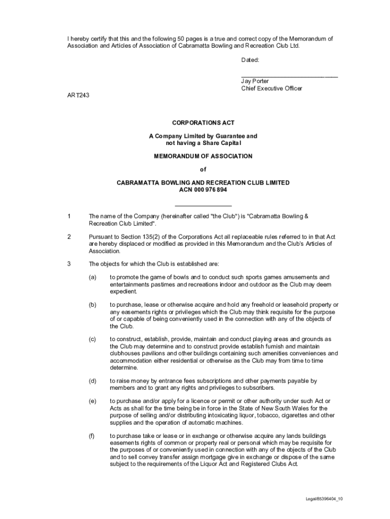 I hereby certify that this and the following 50 pages is a true and correct copy of the Memorandum of Association and Articles of Association of Cabramatta Bowling and Recreation Club Ltd. Dated: