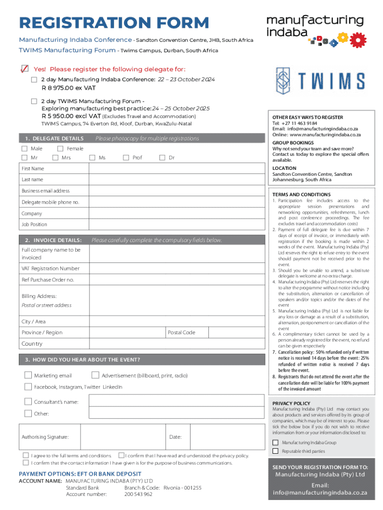 This registration form is designed for delegates attending the Manufacturing Indaba Conference and TWIMS Manufacturing Forum taking place in South Africa. It collects necessary delegate details, invoice information, and payment options, alongside terms and conditions regarding participation, cancellations, and privacy policies.