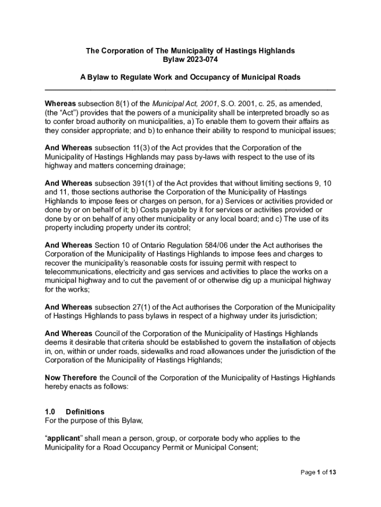 The Corporation of The Municipality of Hastings Highlands Bylaw 2023074 A Bylaw to Regulate Work and Occupancy of Municipal Roads ___ Whereas subsection 8(1) of the Municipal Act, 2001, S.O. 2001,
