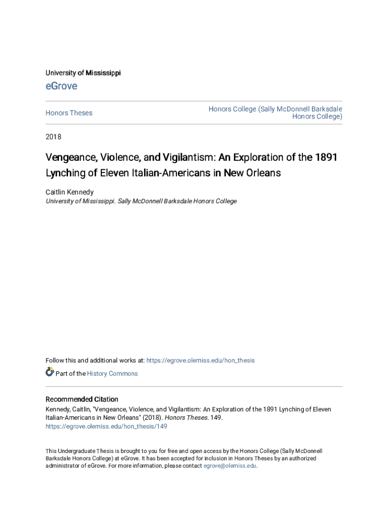 University of MississippieGrove Honors ThesesHonors College (Sally McDonnell Barksdale Honors College)2018Vengeance, Violence, and Vigilantism: An Exploration of the 1891 Lynching of Eleven ItalianAmericans