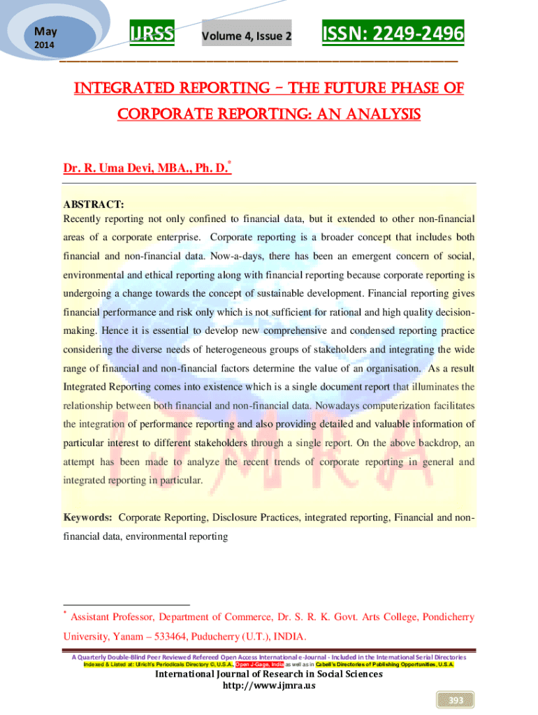 This document analyzes the emerging trends in corporate reporting, particularly focusing on integrated reporting which encompasses both financial and non-financial data, reflecting the importance of sustainable development in corporate practices. It discusses the need for comprehensive reporting that meets the diverse information needs of stakeholders, and examines various dimensions of corporate reporting.