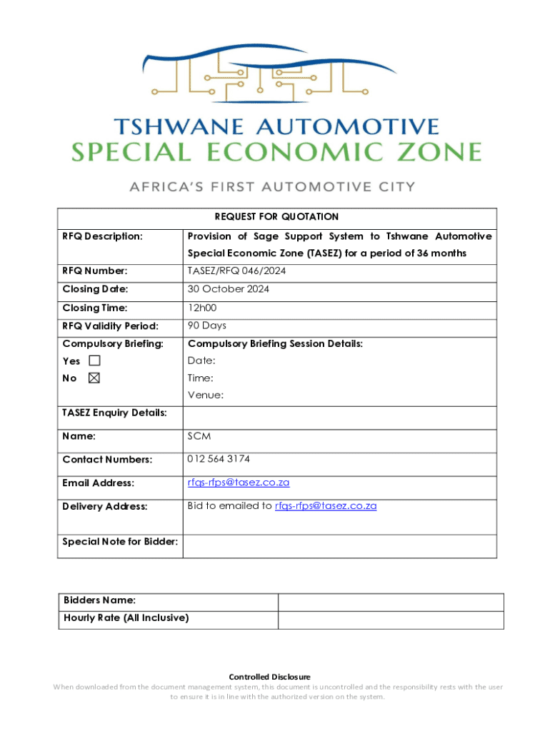 REQUEST FOR QUOTATION RFQ Description:Provision of Sage Support System to Tshwane Automotive Special Economic Zone (TASEZ) for a period of 36 monthsRFQ Number:TASEZ/RFQ 046/2024Closing Date:30 October