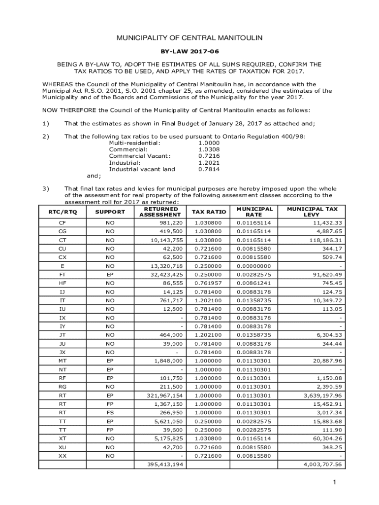 This by-law establishes the estimates of all sums required, confirms the tax ratios to be applied, and sets the rates of taxation for the Municipality of Central Manitoulin for the year 2017. It outlines the tax rates and levies for various assessment classes, the procedures for payment, and penalties for non-payment.