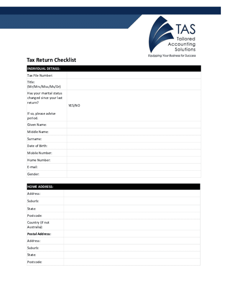 Tax Return Checklist INDIVIDUAL DETAILS: Tax File Number: Title: (Mr/Mrs/Miss/Ms/Dr) Has your marital status changed since your last return? If so, please advise period. Given Name: Middle Name: Surname: