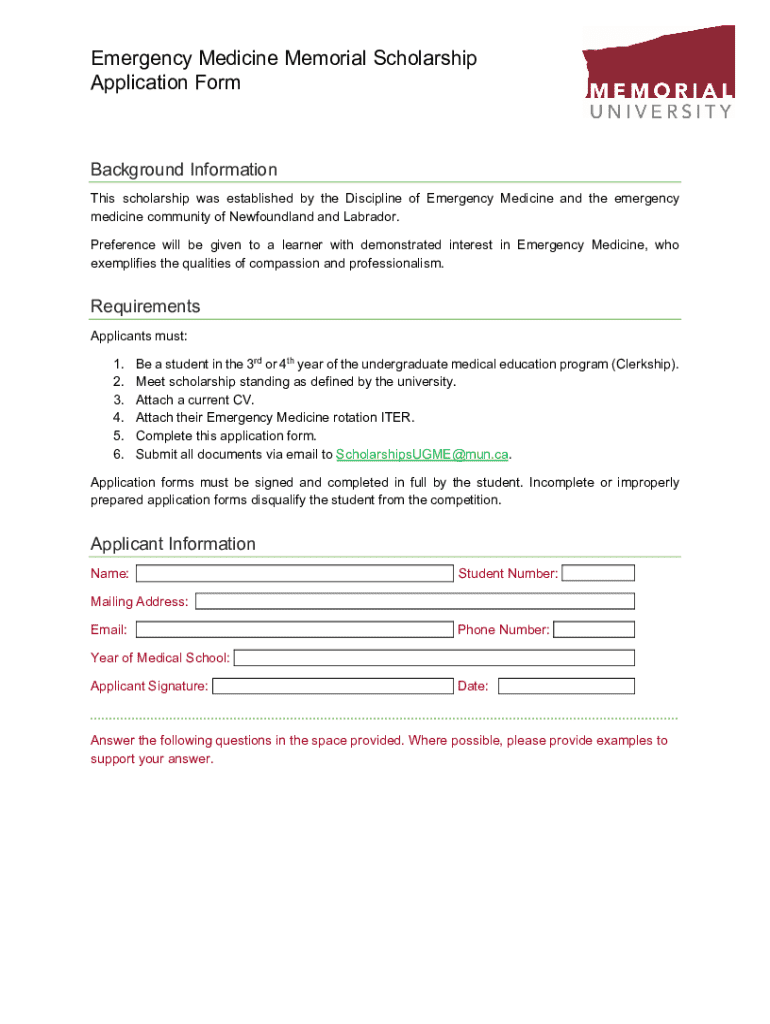 Emergency Medicine Memorial Scholarship Application FormBackground Information This scholarship was established by the Discipline of Emergency Medicine and the emergency medicine community of Newfoundland