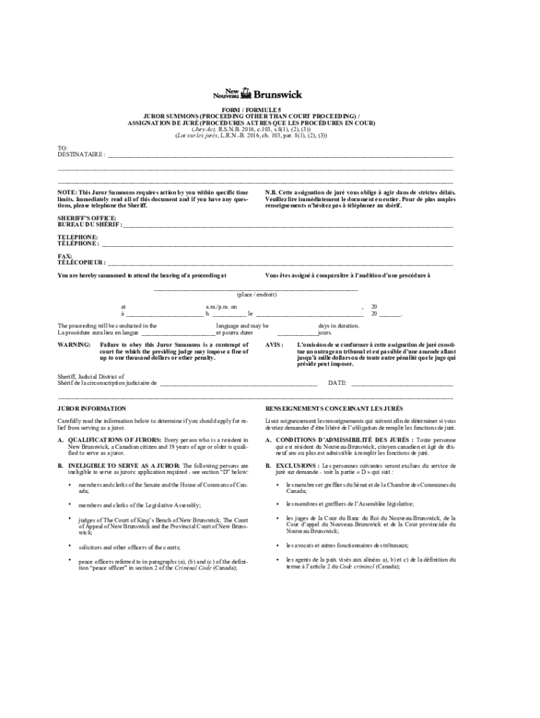 95126Loi sur les jursJ3.1FORM / FORMULE 5 JUROR SUMMONS (PROCEEDING OTHER THAN COURT PROCEEDING) / ASSIGNATION DE JUR (PROCDURES AUTRES QUE LES PROCDURES EN COUR) (Jury Act, R.S.N.B. 2016, c.103,