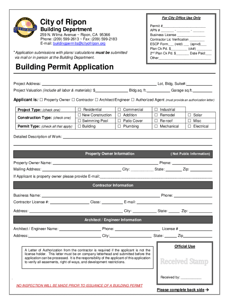 This document serves as a formal application for a building permit in the City of Ripon. It includes space for essential information such as the project address, applicant details, project valuation, and type of work being performed. The form must be completed and submitted to the Building Department along with required documentation such as contractor verification and any necessary permits.