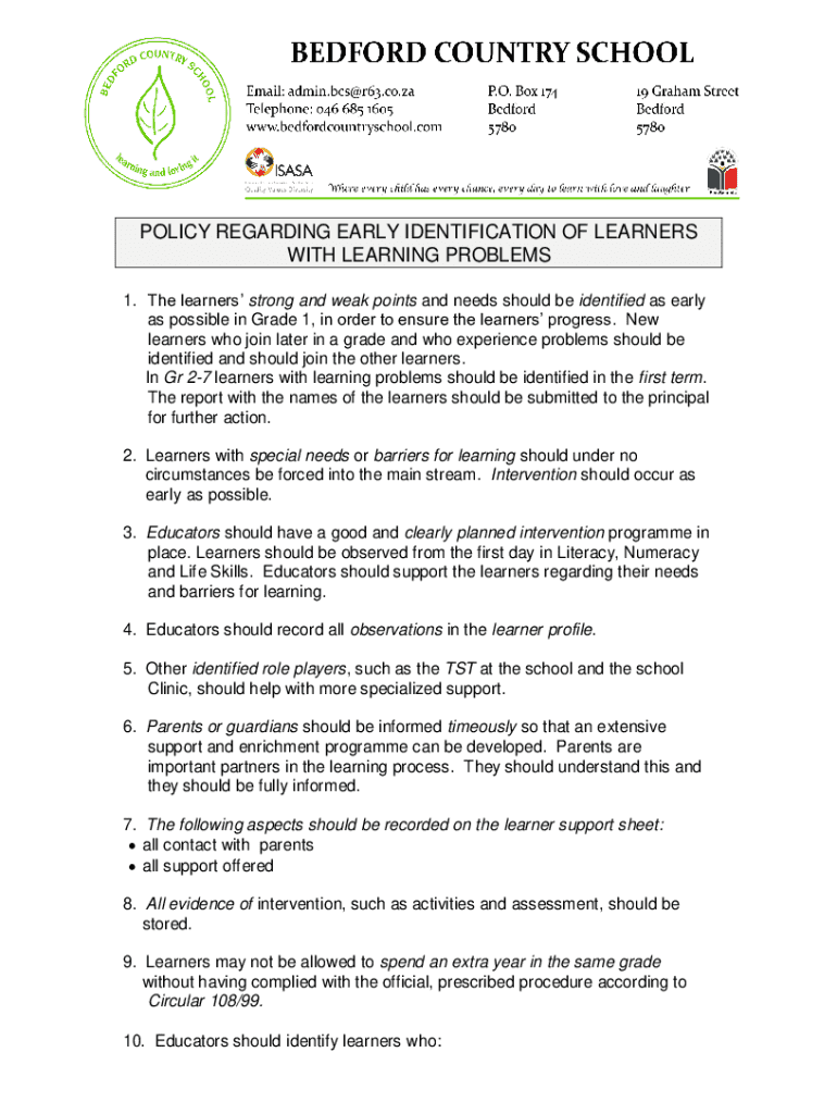 Get the free Policy Regarding Early Identification of Learners With Learning Problems