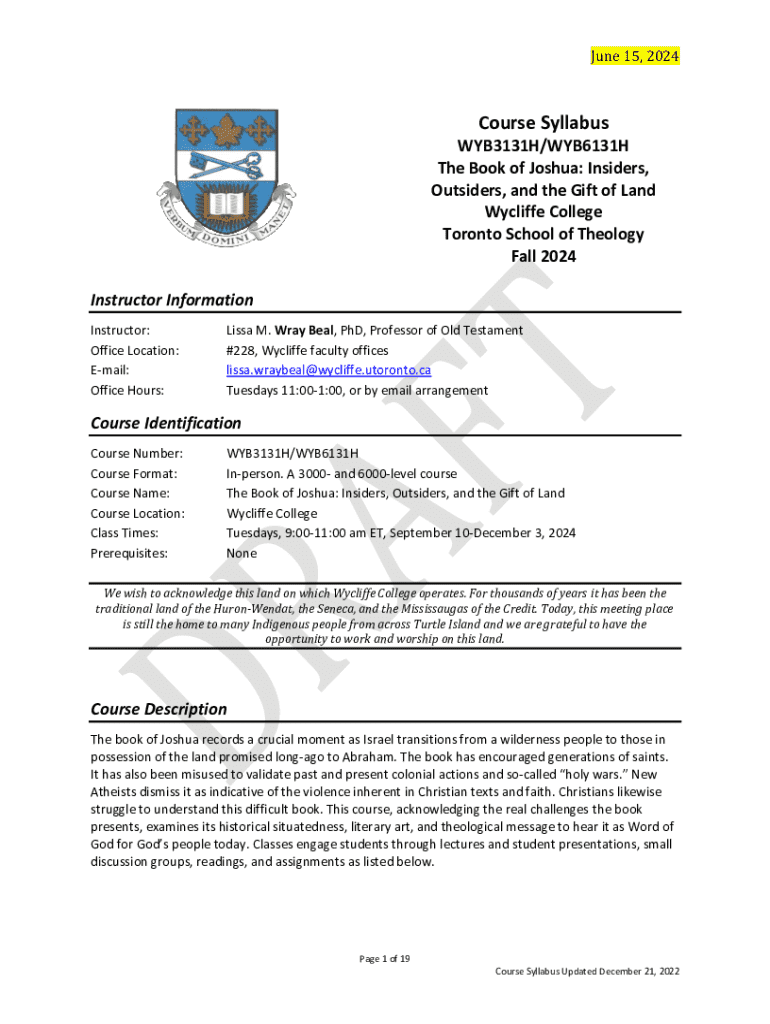 This course syllabus outlines a comprehensive study of the Book of Joshua, focusing on its historical, literary, and theological aspects. It explores Israel\'s transition from a wilderness people to land possessors, addressing themes of colonialism, warfare violence, and interpretation of biblical texts. The syllabus includes course logistics, required readings, learning outcomes, and evaluation criteria for students.