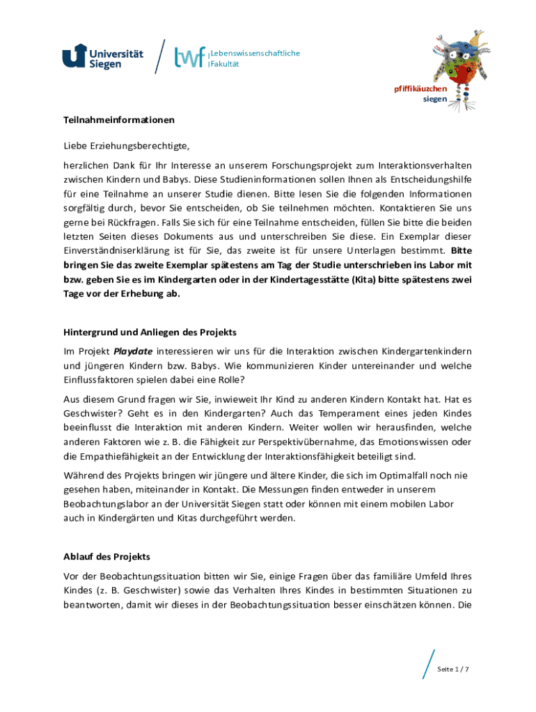Lebenswissenschaftliche Fakultt pfiffikuzchen siegenTeilnahmeinformationen Liebe Erziehungsberechtigte, herzlichen Dank fr Ihr Interesse an unserem Forschungsprojekt zum Interaktionsverhalten zwischen