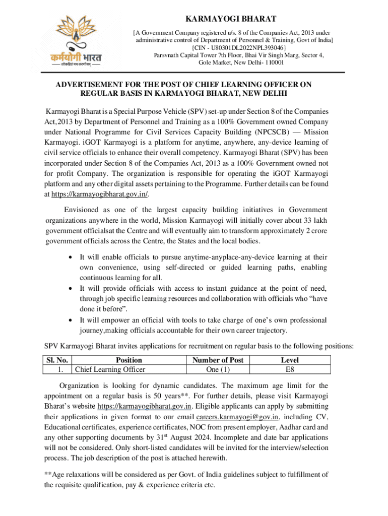 KARMAYOGI BHARAT [A Government Company registered u/s. 8 of the Companies Act, 2013 under administrative control of Department of Personnel & Training, Govt of India] CIN U80301DL2022NPL393046 Parsvnath