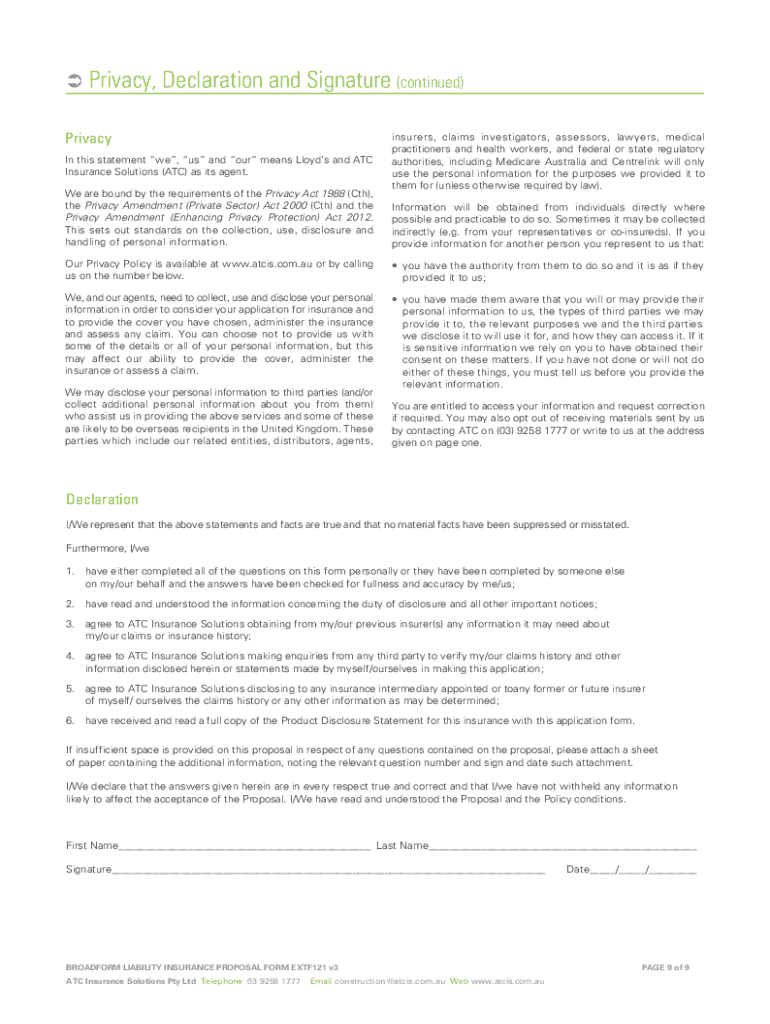 This proposal form is designed for companies or individuals seeking Broadform Liability Insurance. It requires detailed disclosure of personal and business information, including insured names, limits of liability, business activities, insurance history, and claims history. Additionally, it outlines the duty of disclosure and privacy terms regarding the handling of personal information.
