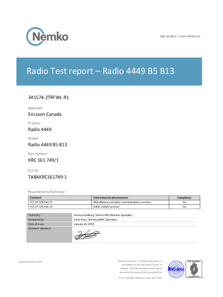 ONE WORLDOUR APPROVALRadio Test report Radio 4449 B5 B13 3415742TRFWLR1 Applicant:Ericsson Canada Product:Radio 4449 Model:Radio 4449 B5 B13 Part number:KRC 161 749/1 FCC ID:TA8AKRC1617491 Requirements/Summary: