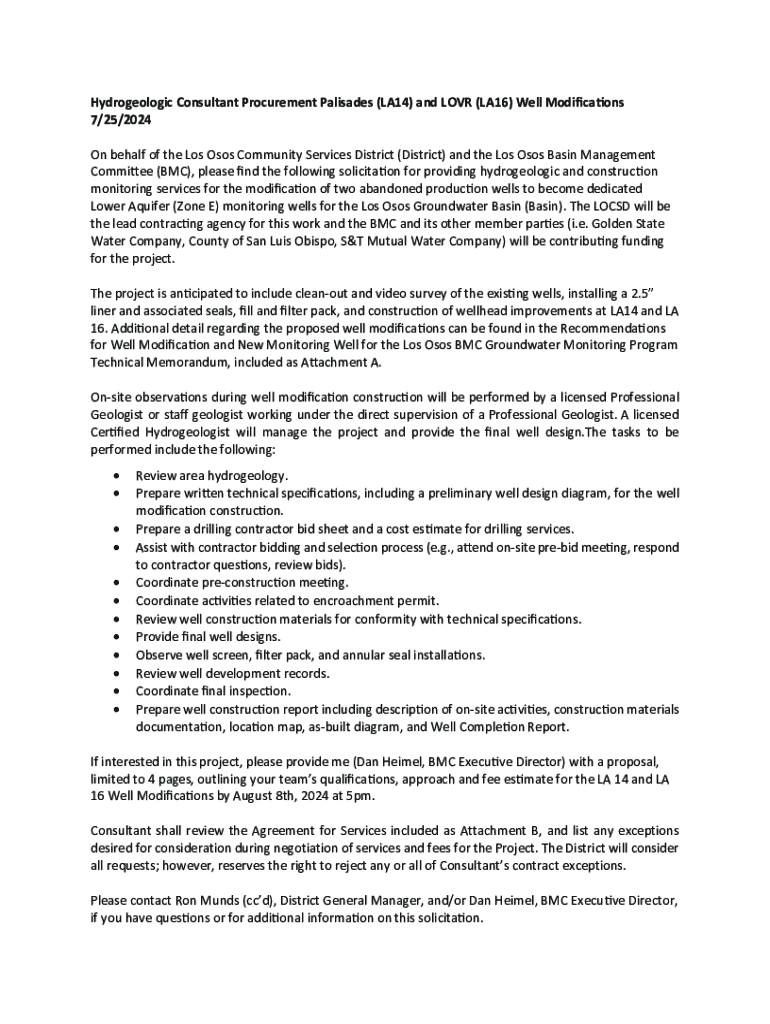 Hydrogeologic Consultant Procurement Palisades (LA14) and LOVR (LA16) Well Modica ons 7/25/2024 On behalf of the Los Osos Community Services District (District) and the Los Osos Basin Management Commi