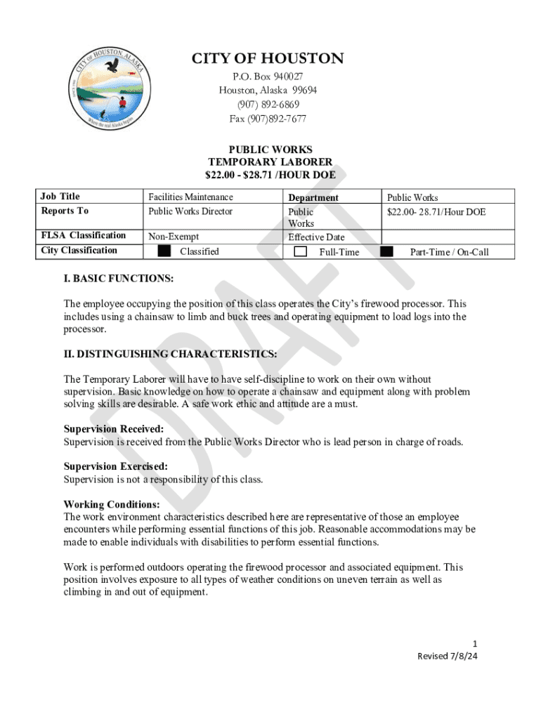 This document outlines the job description and requirements for the Temporary Laborer position at the City of Houston\'s Public Works department. The role primarily involves operating a firewood processor and chainsaw, performing maintenance on equipment, and delivering firewood to community residents while ensuring safety and compliance with federal regulations.