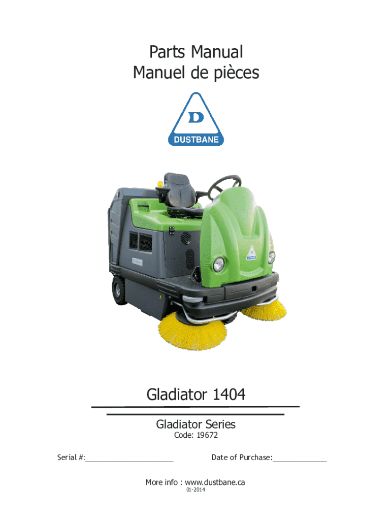 Parts Manual Manuel de picesGladiator 1404 Gladiator Series Code: 19672Serial #:___Date of Purchase:___More info : www.dustbane.ca 012014Wheels AxleRef.2Part N.DescriptionQuantity Validity From1VTVT87271SCREW