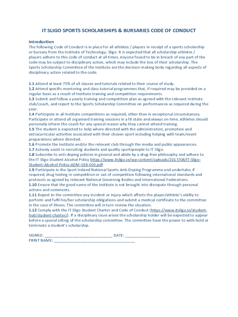 IT SLIGO SPORTS SCHOLARSHIPS & BURSARIES CODE OF CONDUCT IntroductionThe following Code of Conduct is in place for all athletes / players in receipt of a sports scholarship or bursary from the Institute