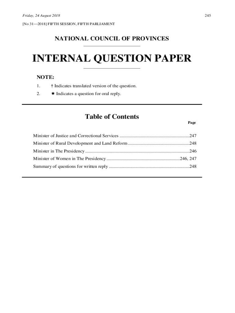 Friday, 24 August 2018245[No 312018] FIFTH SESSION, FIFTH PARLIAMENTNATIONAL COUNCIL OF PROVINCES ___INTERNAL QUESTION PAPER ___NOTE: 1. Indicates translated version of the question.2. Indicates a