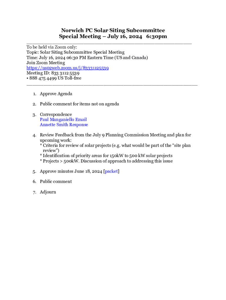 Norwich PC Solar Siting Subcommittee Special Meeting July 16, 2024 6:30pm ___ To be held via Zoom only: Topic: Solar Siting Subcommittee Special Meeting Time: July 16, 2024 06:30 PM Eastern Time (US