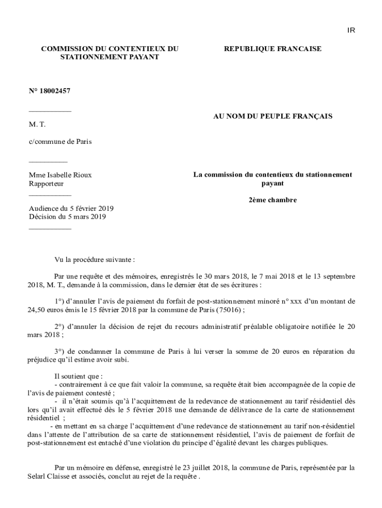 IR COMMISSION DU CONTENTIEUX DU STATIONNEMENT PAYANTREPUBLIQUE FRANCAISEN 18002457 ___ AU NOM DU PEUPLE FRANAIS M. T. c/commune de Paris ___ Mme Isabelle Rioux Rapporteur ___La commission du contentieux