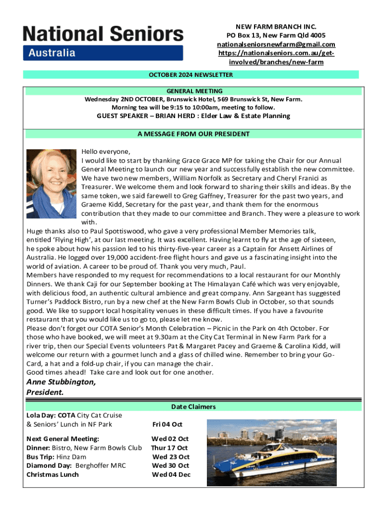 NEW FARM BRANCH INC. PO Box 13, New Farm Qld 4005 nationalseniorsnewfarm@gmail.com https://nationalseniors.com.au/getinvolved/branches/newfarm OCTOBER 2024 NEWSLETTER GENERAL MEETING Wednesday 2ND