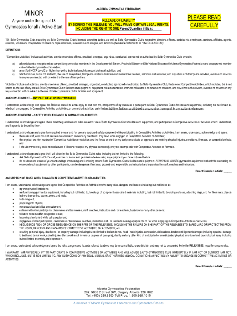 This document serves as a release of liability and waiver of claims for minors participating in gymnastics activities at Salto Gymnastics Club. By signing this form, participants and their guardians acknowledge the risks involved and waive certain legal rights, including the right to sue the releasees.