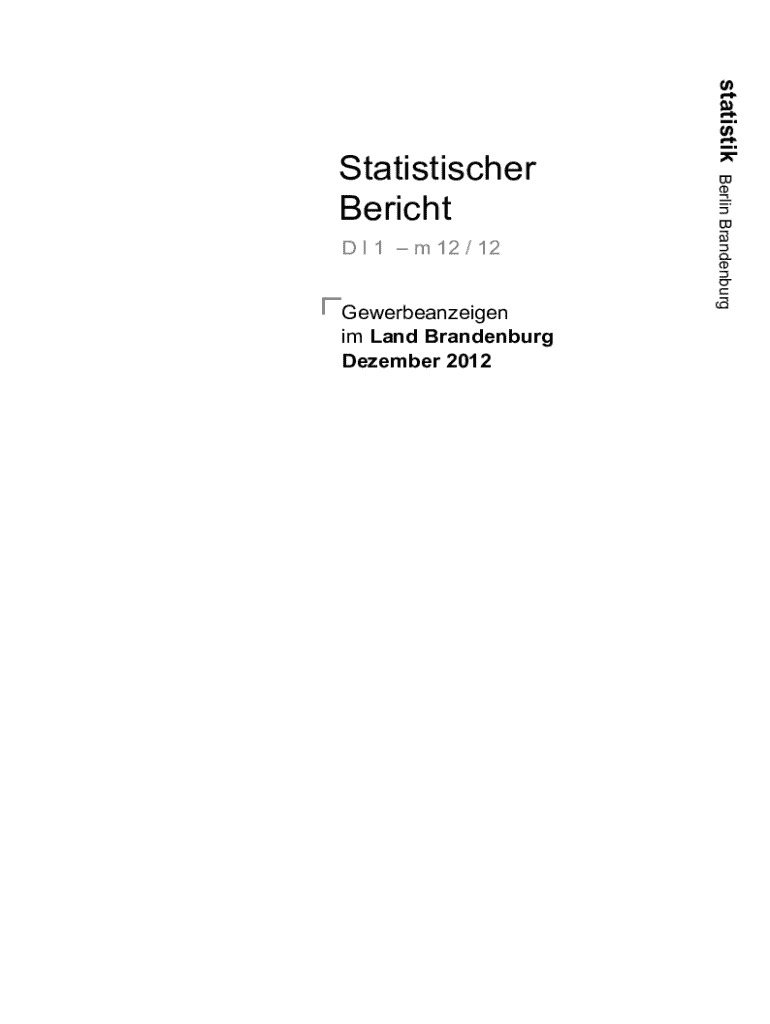 Gewerbeanzeigen im Land Brandenburg Dezember 2012Berlin BrandenburgD I 1 m 12 / 12statistikStatistischer BerichtImpressum Statistischer Bericht D I 1 m 12 / 12 Erscheinungsfolge: monatlich Erschienen