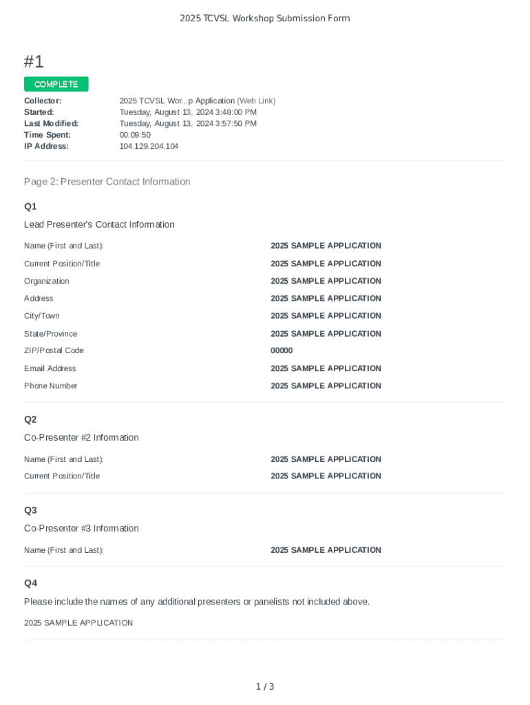 2025 TCVSL Workshop Submission Form#1 COMPLETE Collector: Started: Last Modified: Time Spent: IP Address:2025 TCVSL Wor...p Application (Web Link) Tuesday, August 13, 2024 3:48:00 PM Tuesday, August