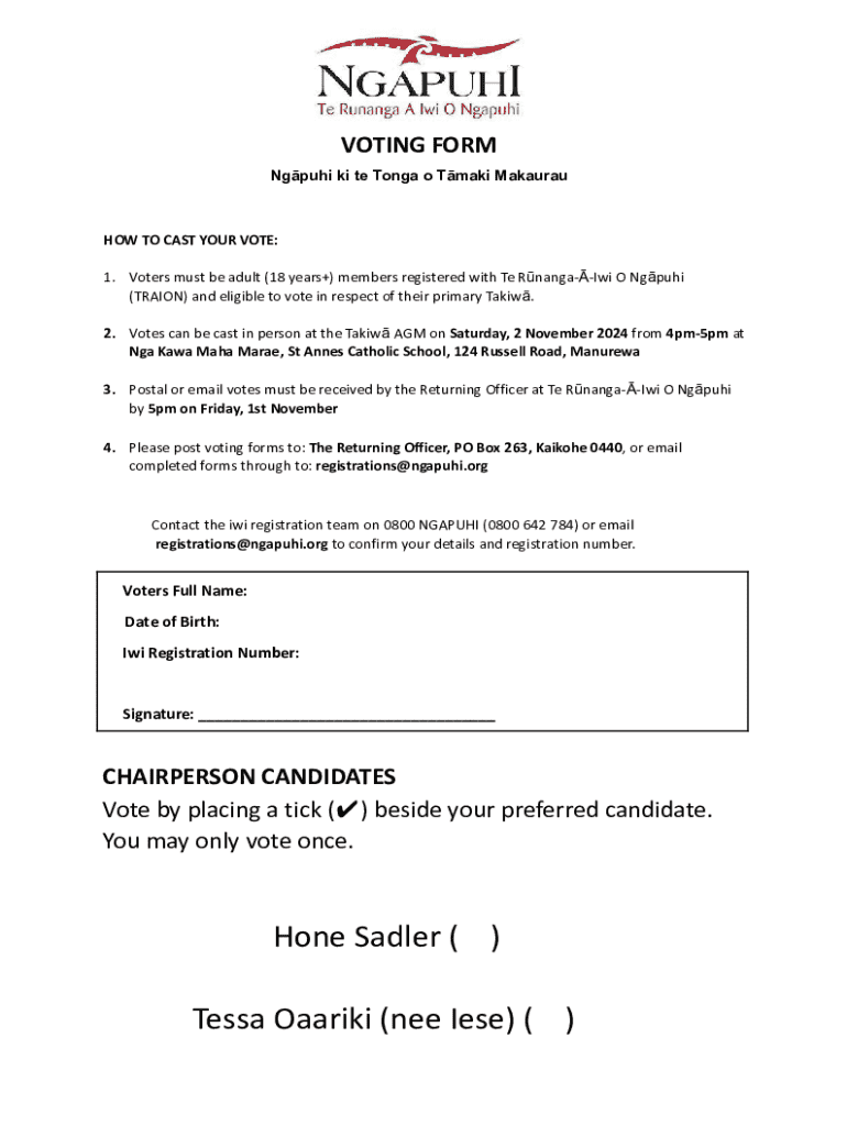 Get the free Voting Form Chair- Ngpuhi ki te Tonga o Tmaki Makaurau.docx