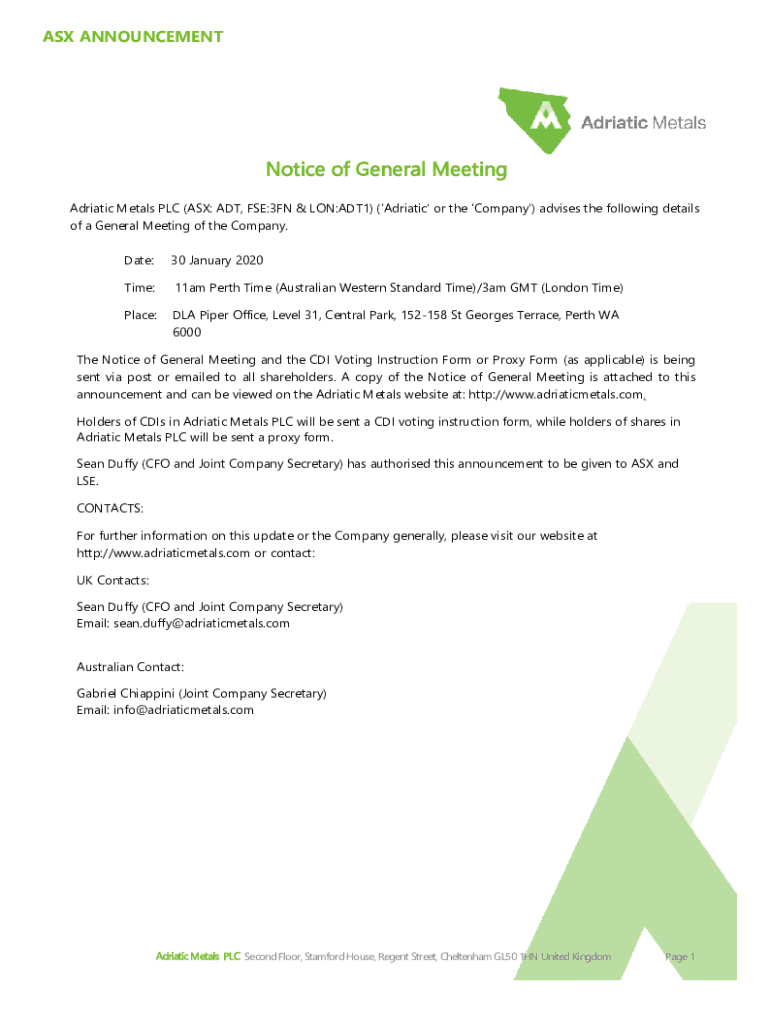 This document serves as a formal notice for the General Meeting of Adriatic Metals PLC scheduled for 30 January 2020. It includes details on the meeting\'s agenda, resolutions for shareholder approval regarding options and performance rights granted to company directors, and other corporate actions.
