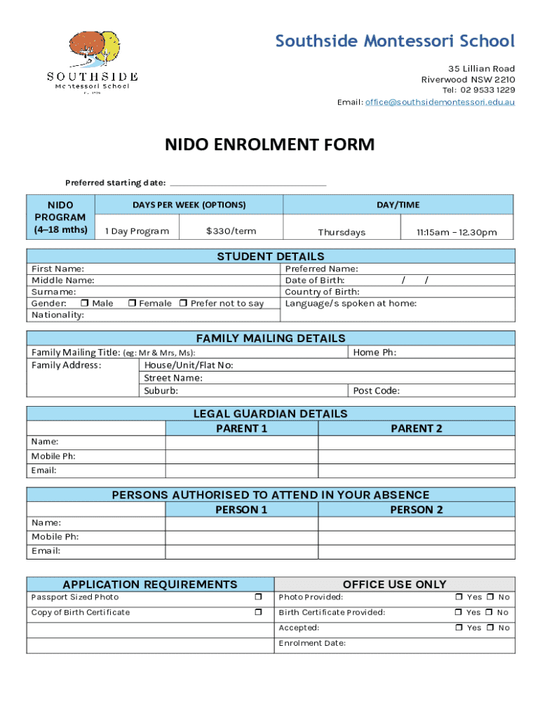 Southside Montessori School 35 Lillian Road Riverwood NSW 2210Tel: 02 9533 1229 Email: office@southsidemontessori.edu.auNIDO ENROLMENT FORM Preferred starting date:NIDO PROGRAM (418 mths)DAYS PER