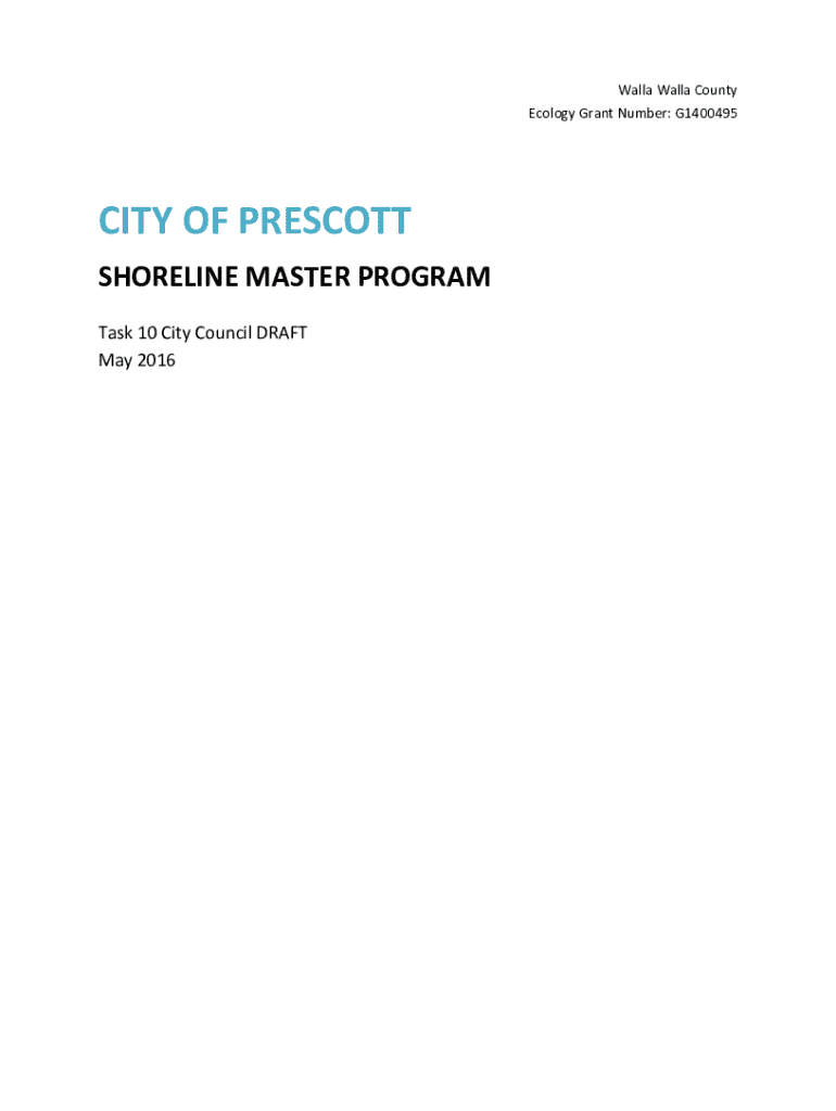 Walla Walla County Ecology Grant Number: G1400495CITY OF PRESCOTT SHORELINE MASTER PROGRAM Task 10 City Council DRAFT May 2016CITY OF PRESCOTT DRAFT SHORELINE MASTER PROGRAM 2016 PRESCOTT CITY COUNCIL