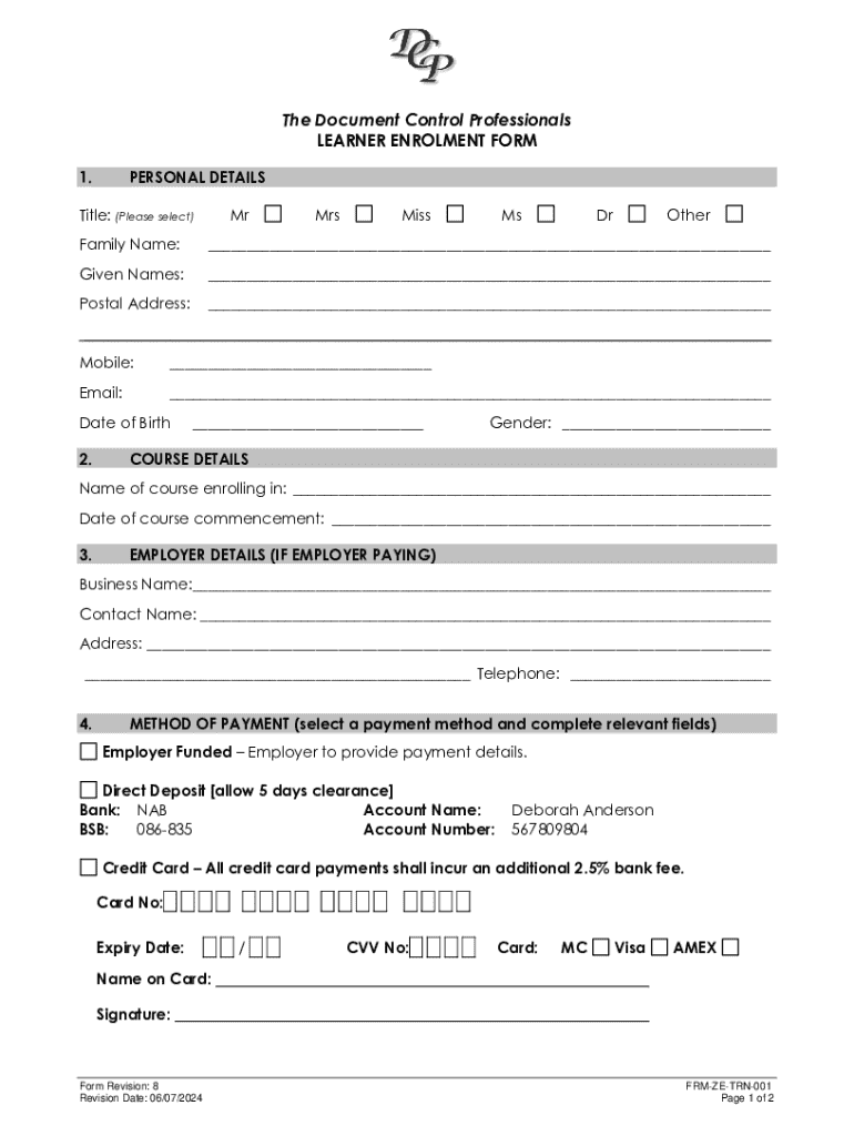 The Document Control Professionals LEARNER ENROLMENT FORM 1.PERSONAL DETAILSTitle: (Please select)MrMrsMissMsDrOtherFamily Name:___Given Names:___Postal Address:______ Mobile:___Email:___Date of Birth