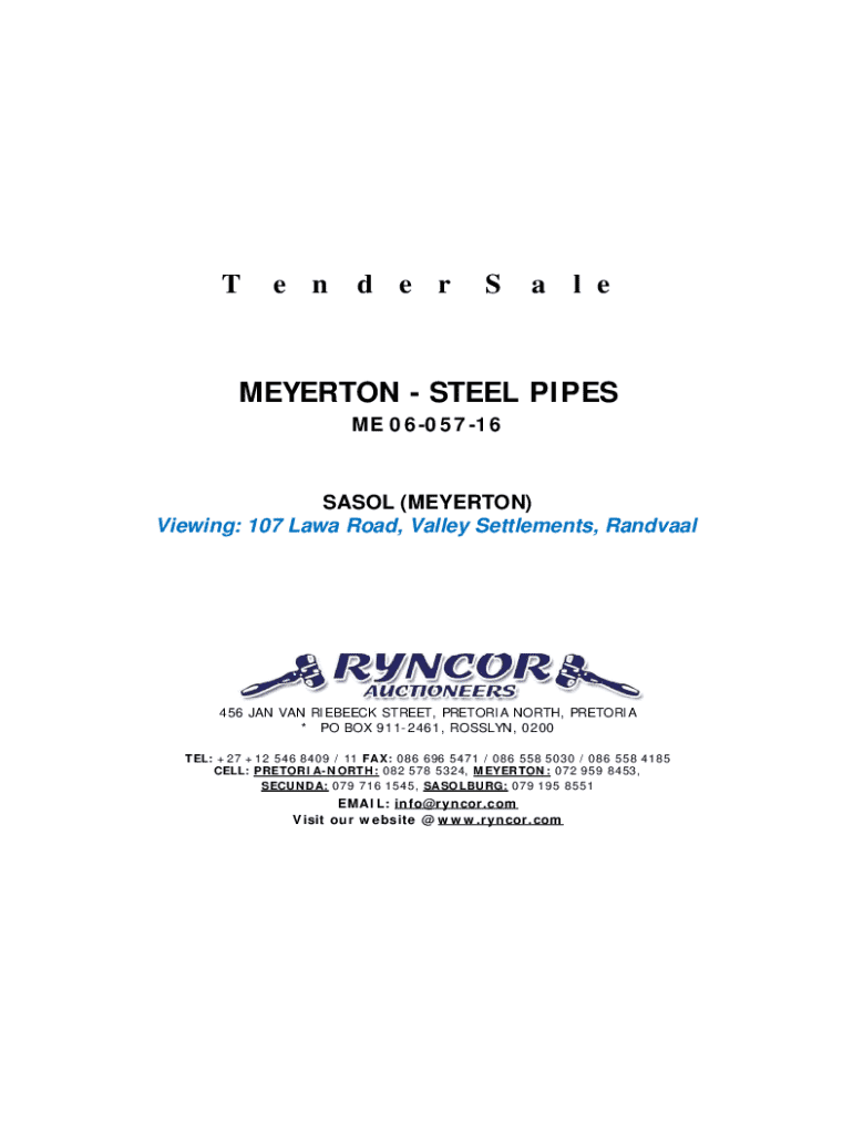 This document outlines the terms and conditions for a tender sale conducted by Ryncor Auctioneers on behalf of Sasol for steel pipes. It includes critical instructions for bidders, payment details, collection procedures, and legal disclaimers regarding the sale of the items as \'voetstoots\', emphasizing that items are sold as-is, with all risks assumed by the buyer. The document also details the necessary documentation required for bidding, including identification and proof of residence.