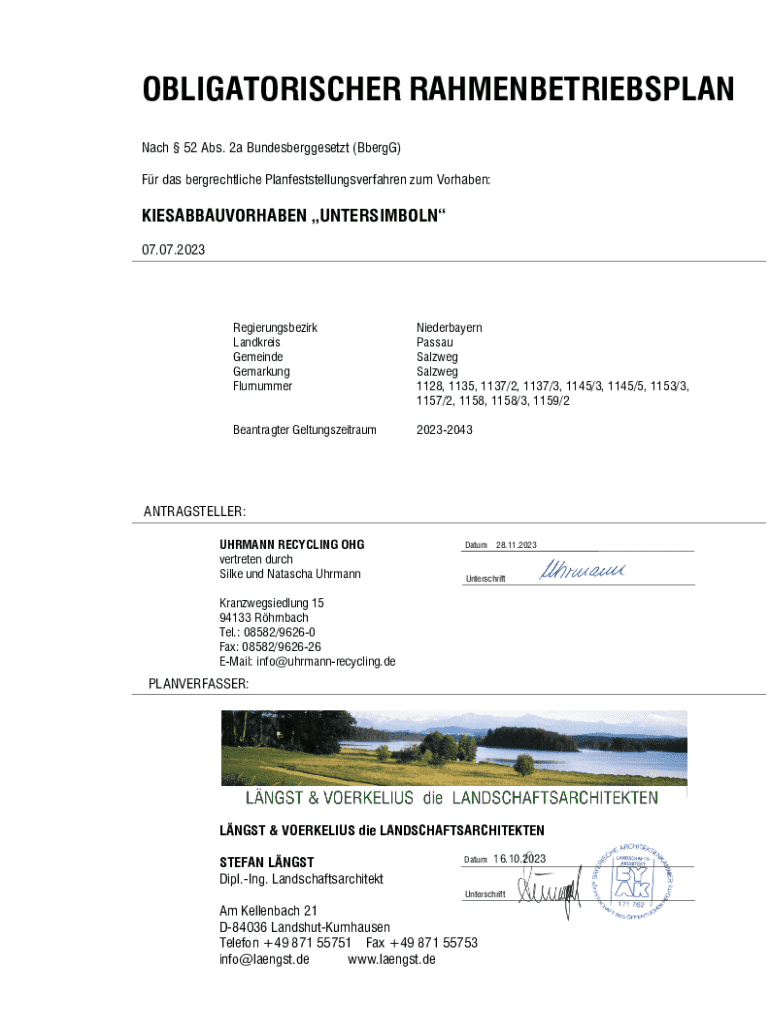 OBLIGATORISCHER RAHMENBETRIEBSPLAN Nach 52 Abs. 2a Bundesberggesetzt (BbergG) Fr das bergrechtliche Planfeststellungsverfahren zum Vorhaben:KIESABBAUVORHABEN UNTERSIMBOLN 07.07.2023Regierungsbezirk
