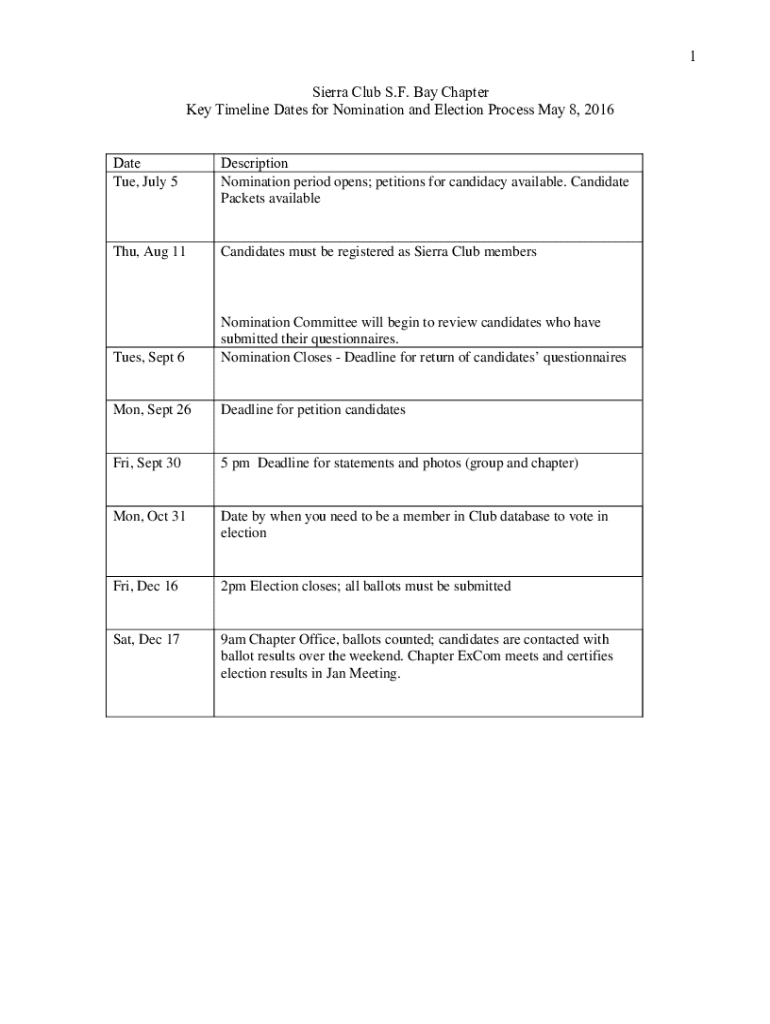 1 Sierra Club S.F. Bay Chapter Key Timeline Dates for Nomination and Election Process May 8, 2016 Date Tue, July 5Description Nomination period opens; petitions for candidacy available. Candidate