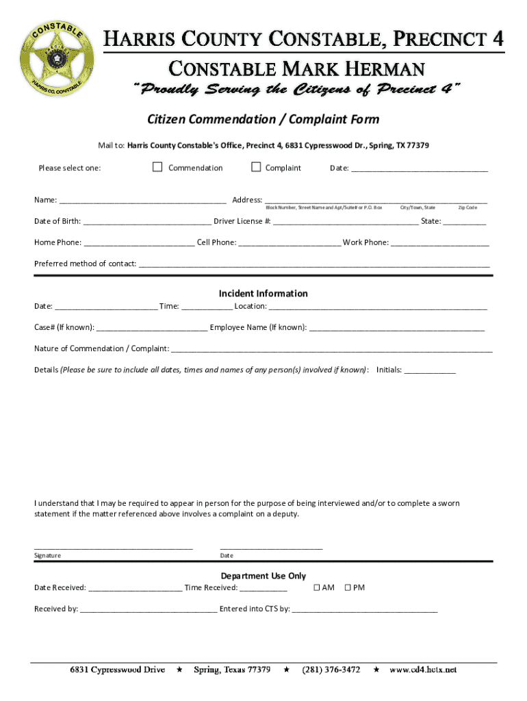 A form for submitting commendations or complaints regarding the services provided by the Harris County Constable\'s Office, Precinct 4. It allows citizens to provide personal information, incident details, and a formal statement regarding their experience.