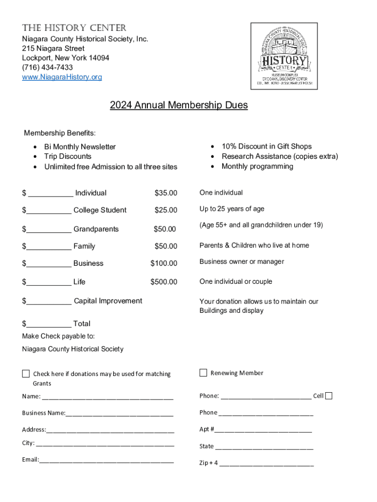 THE HISTORY CENTER Niagara County Historical Society, Inc. 215 Niagara Street Lockport, New York 14094 (716) 4347433 www.NiagaraHistory.org2024 Annual Membership Dues Membership Benefits: Bi Monthly