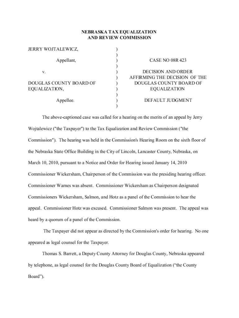 This document is a decision from the Nebraska Tax Equalization and Review Commission regarding an appeal by Jerry Wojtalewicz against the Douglas County Board of Equalization. It details the findings and conclusions of the Commission after a hearing in which the Taxpayer failed to appear, leading to a default judgment affirming the County Board\'s valuation of the subject property for tax purposes.