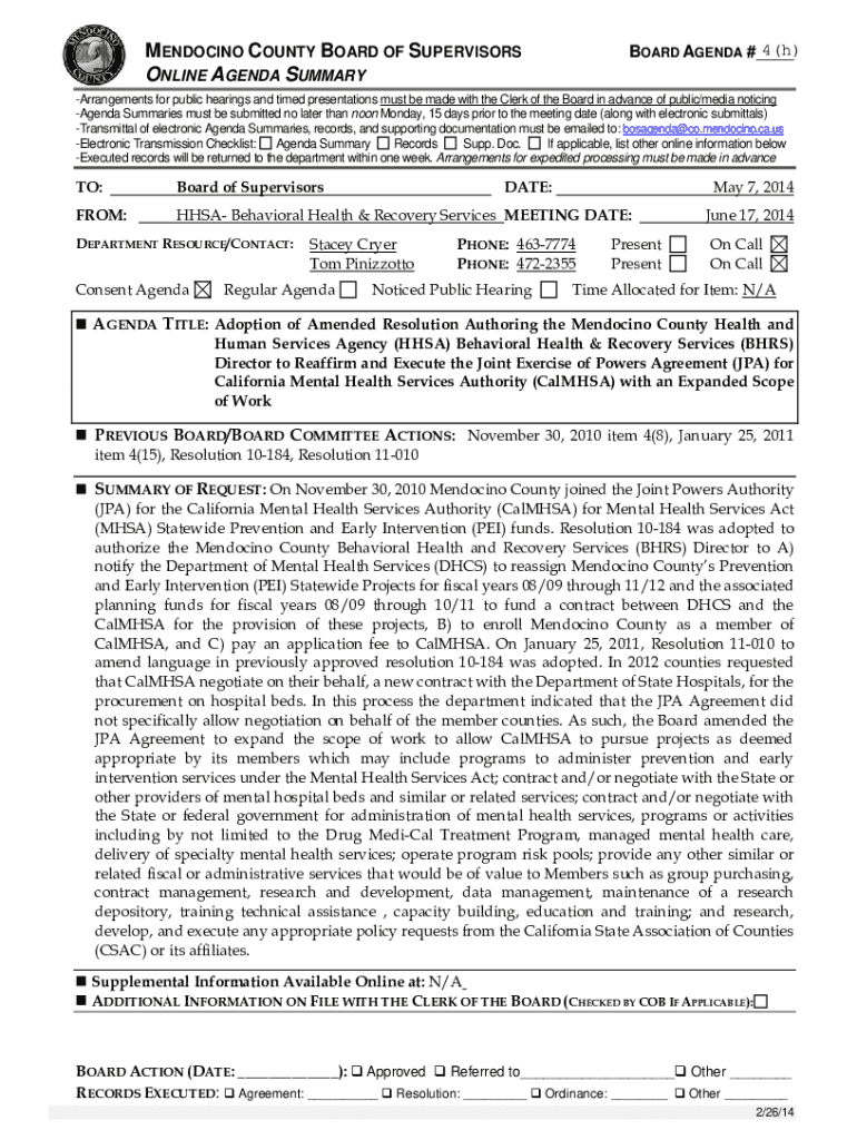 MENDOCINO COUNTY BOARD OF SUPERVISORS ONLINE AGENDA SUMMARY4(h) BOARD AGENDA #___Arrangements for public hearings and timed presentations must be made with the Clerk of the Board in advance of public/media