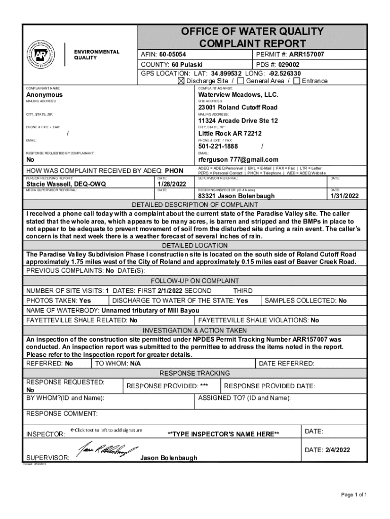 Get the free Office of Water Quality Complaint Report