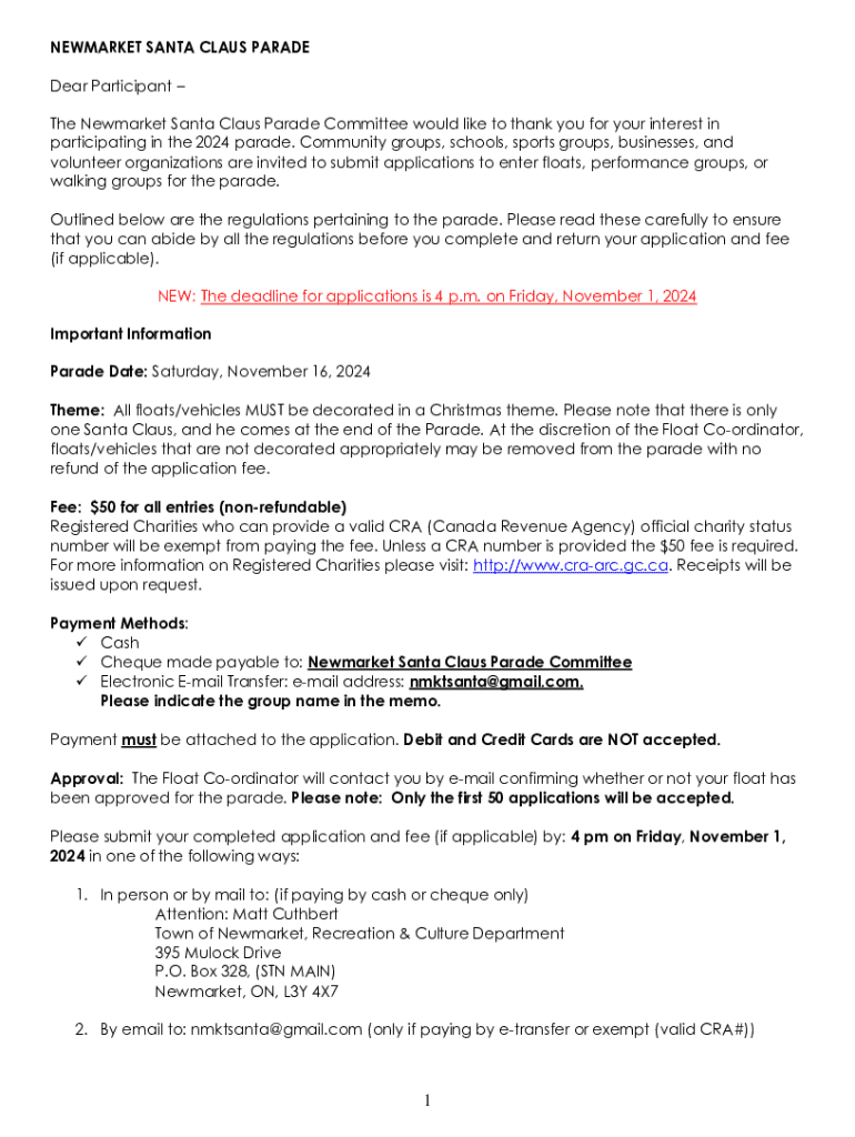 This document outlines the regulations and application process for participating in the Newmarket Santa Claus Parade scheduled for November 16, 2024. It includes important dates, fees, safety regulations, and application details for community groups, schools, and organizations wishing to enter floats, performance groups, or walking groups in the parade.