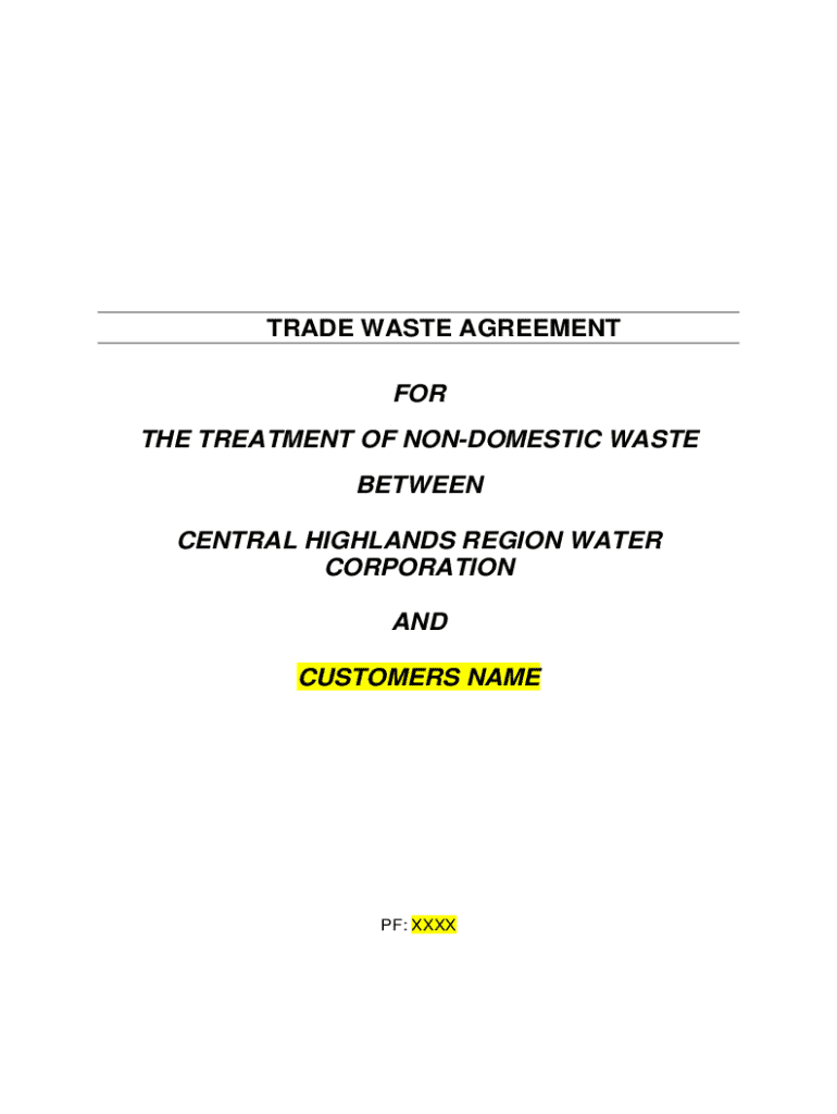 TRADE WASTE AGREEMENT FOR THE TREATMENT OF NONDOMESTIC WASTE BETWEEN CENTRAL HIGHLANDS REGION WATER CORPORATION AND CUSTOMERS NAMEPF: XXXXPART 1PARTIES TO THE TRADE WASTE AGREEMENTThe customer requires