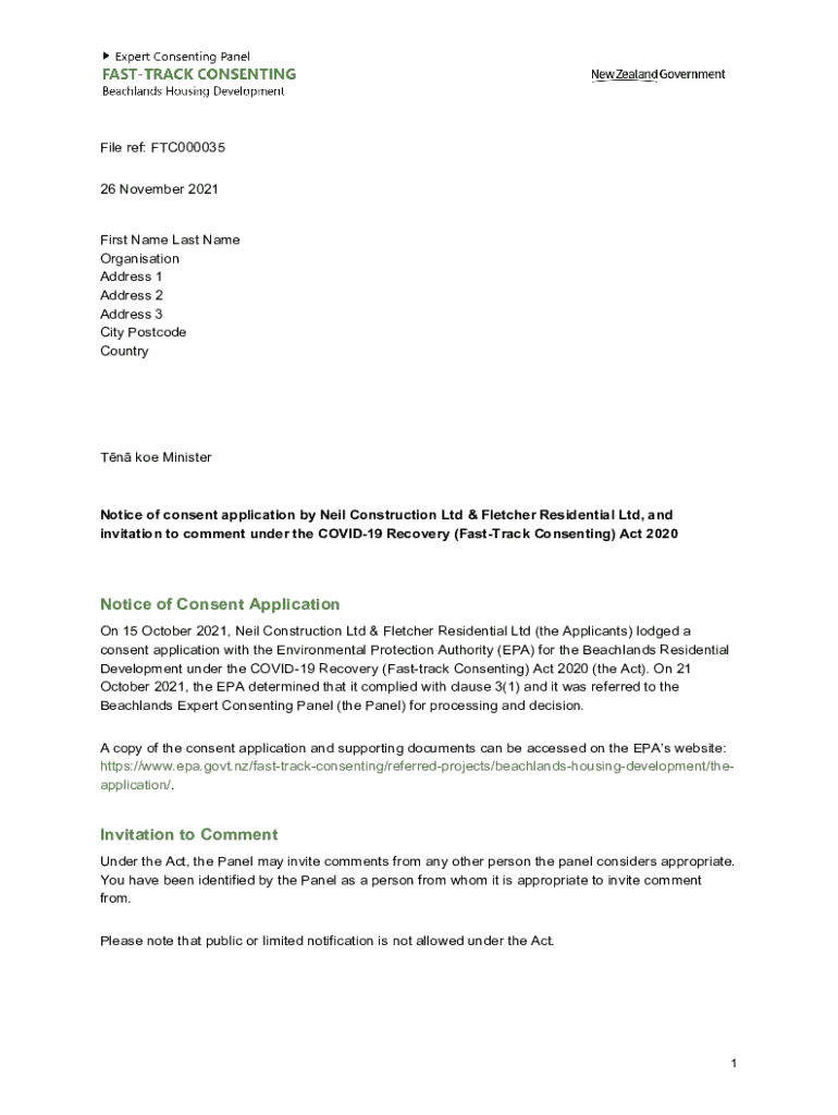File ref: FTC000035 26 November 2021 First Name Last Name Organisation Address 1 Address 2 Address 3 City Postcode CountryTn koe MinisterNotice of consent application by Neil Construction Ltd & Fletcher