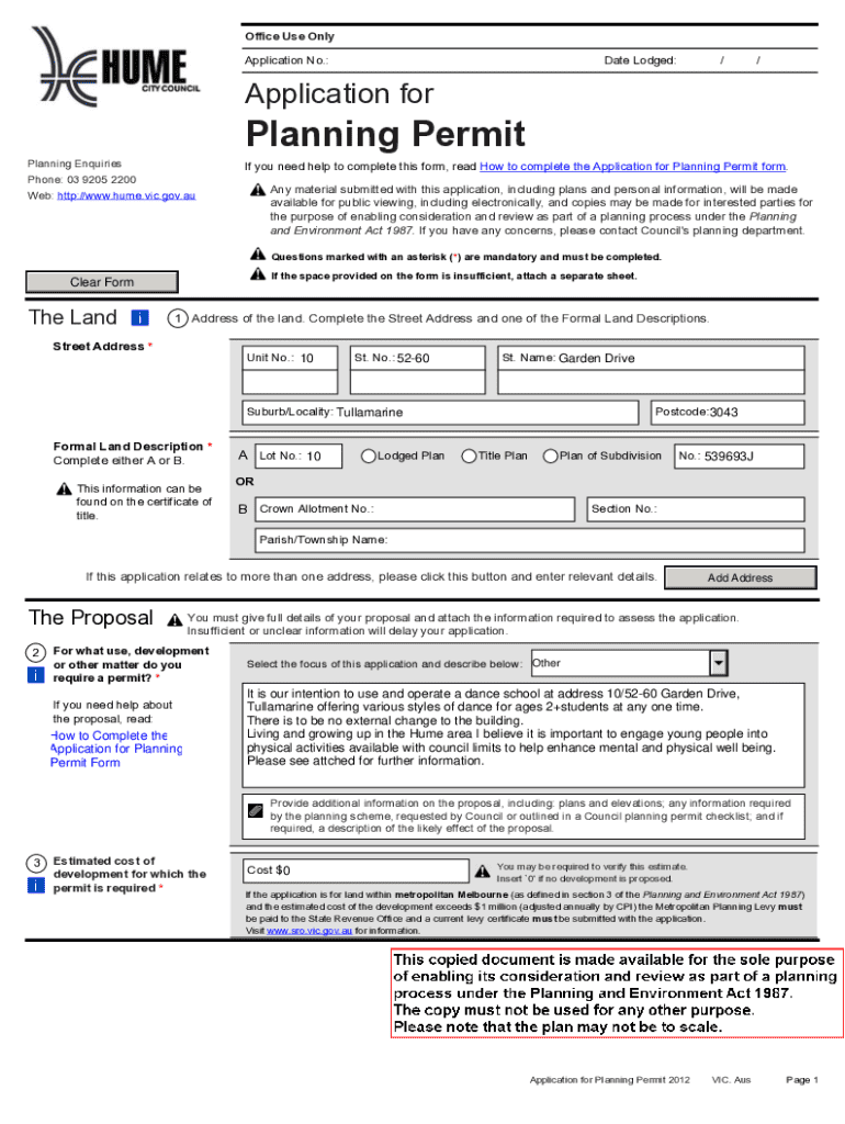 Office Use Only Application No.:Date Lodged://Application forPlanning Permit Planning Enquiries Phone: 03 9205 2200 Web: http://www.hume.vic.gov.auIf you need help to complete this form, read How