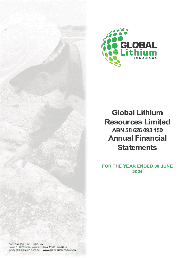 Global Lithium Resources Limited ABN 58 626 093 150Annual Financial Statements FOR THE YEAR ENDED 30 JUNE 2024ACN 626 093 150 | ASX: GL1 Level 1, 16 Ventnor Avenue, West Perth, WA6005 info@globallithium.com.au