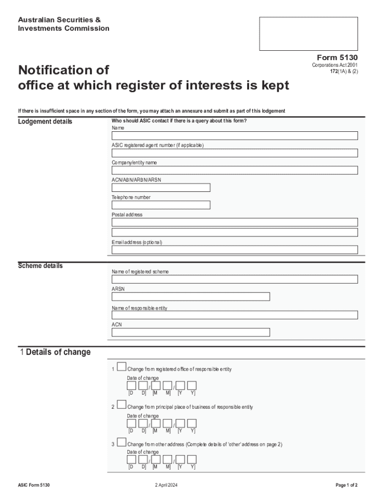 Australian Securities & Investments CommissionNotification of office at which register of interests is keptForm 5130Corporations Act 2001 172(1A) & (2)If there is insufficient space in any section