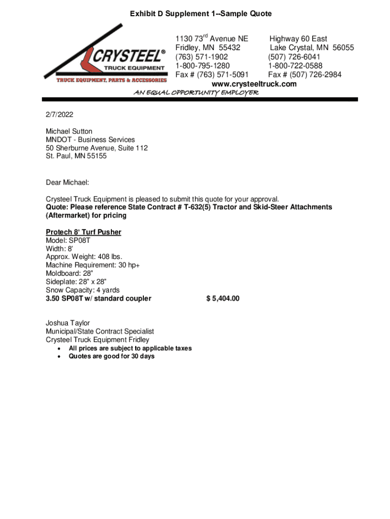 This document includes a sample quote submitted by Crysteel Truck Equipment for tractor and skid-steer attachments, specifically a Protech 8’ Turf Pusher. It outlines the details of the quote, including pricing, specifications, applicable taxes, and an authorization section for the customer. The document also contains an invoice section with order details and terms.