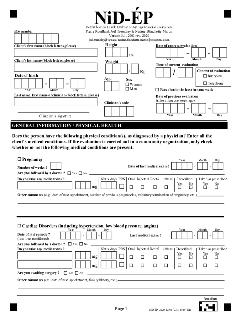 NiDPDetoxification Level: Evaluation by psychosocial interveners Pierre Rouillard, Jol Tremblay & Nadine BlanchetteMartin Version 3.1, 2001 rev. 2020File numberjoel.tremblay@uqtr.ca / nadine.blanchettemartin@ssss.gouv.qc.caHeightClients