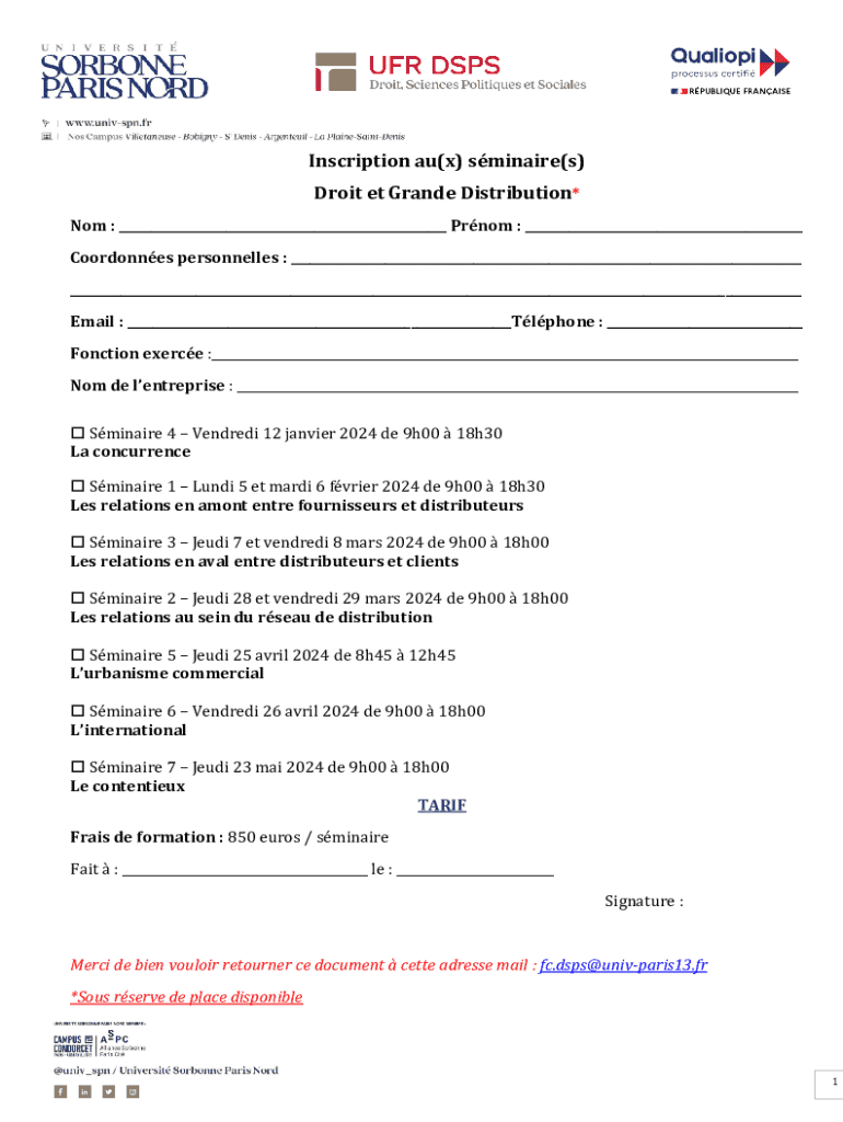 Inscription au(x) sminaire(s) Droit et Grande Distribution* Nom : ___ Prnom : ___ Coordonnes personnelles : ___ ___ Email : ___Tlphone : ___ Fonction exerce :___ Nom de lentreprise : ___ Sminaire